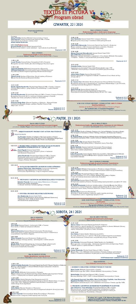 Oczekujemy referatów, opisujących szersze zjawiska w ramach średniowiecznej religijności, ale też studiów szczegółowych, skoncentrowanych na konkretnych przykładach tekstów, a przede wszystkim – podejmujących zagadnienie ich materialnych nośników. Chcemy spojrzeć na średniowieczny kodeks przez pryzmat jego twórców i użytkowników, funkcji pierwotnych (w tym długiego trwania w różnych kontekstach sakralnych) oraz wtórnych (w tym – w obiegu bibliotecznym i kolekcjonerskim), a także pod kątem cech materialnych oraz wartości artystycznych.
